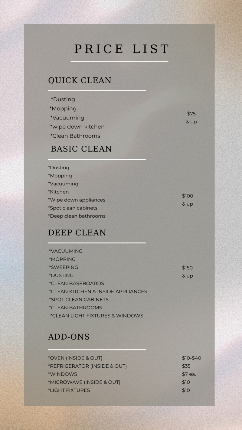 Welcome to the Pricing page of Cleaning with Kelsey🫧. We offer a range of cleaning services at competitive prices to meet your needs. From basic cleaning to deep cleaning, we have you covered. Take a look at our pricing list below and book your appointment today!